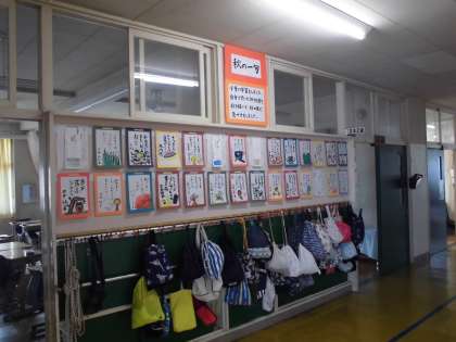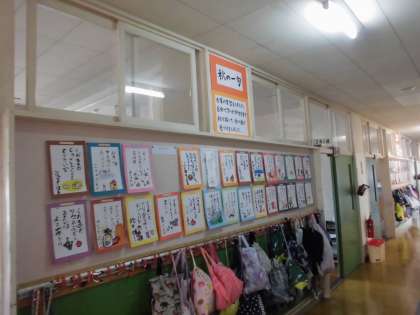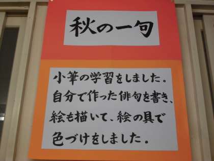 3年生の廊下に、書写の時間に書いた「秋の一句」が飾られています。小筆を使って句を詠み、絵の具を使って絵も描きました。子供たちの描く秋、とてもすてきです。
