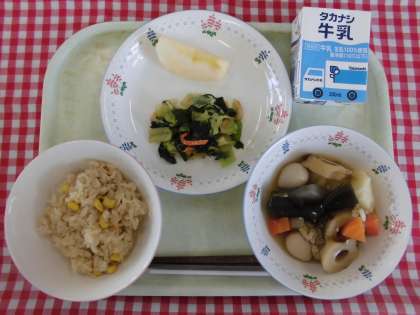 20日(木)の献立は、コーン茶飯、おでん、わかめと野菜のごま酢あえ、くだもの(りんご)、牛乳です。