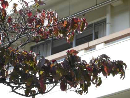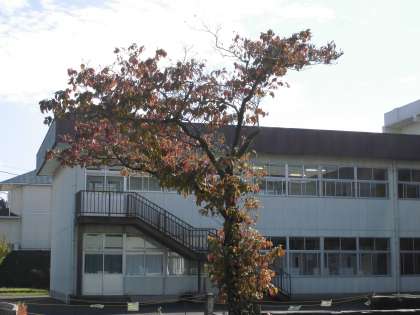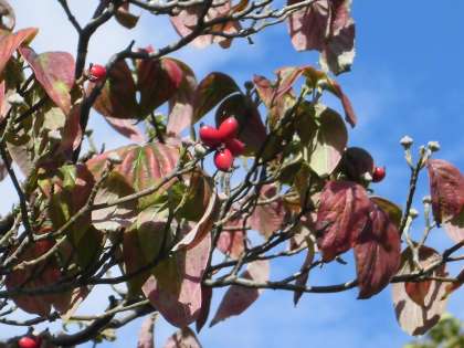 上校庭にある池のそばに「ハナミズキ」があります。このところ葉が色づき、赤い実がついています。太陽の光を受けてとてもきれいです。