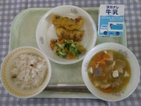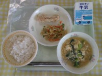 1日(木)の献立は、仙台油麩丼、和風サラダ、くだもの(みかん)、牛乳です。