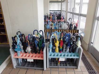 26日(水)は朝から雨が降り、子供たちは傘をさして登校しました。各昇降口に設置してある傘だては、写真のような状況です。子供たちは傘を束ねて収納することができました。