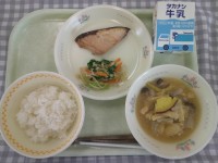 27日(火)の献立は、ご飯、サバの竜田揚げ、キャベツの昆布和え、じゃがいものみそ汁、牛乳です。