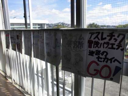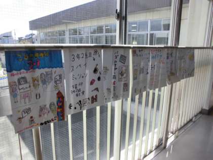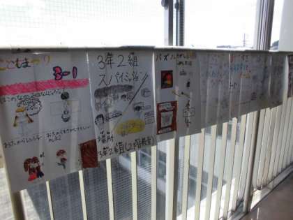 こどもまつりのお店のポスターが、2階と3階のプレイルームに登場しました。3年生以上がお店を出します。ポスター担当の子供たちが、心を込めて描いたことが伝わります。こどもまつりは、27日(水)の午前中に開催します。