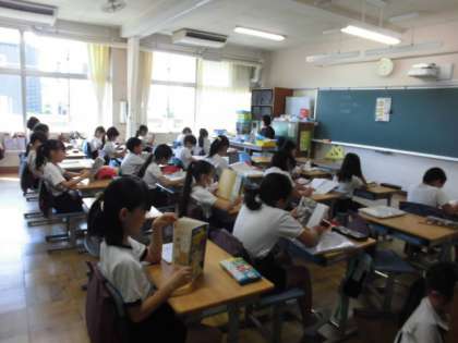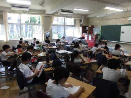 15日(金)の朝は、1年生から4年生までが朝読書をしました。写真は上から、1年2組、2年2組、3年1組の様子です。朝の支度を整えたり、体育着に着替えたりしてから、静かに読書を始めました。