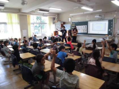 20日(水)1時間目、1年2組は外国語活動の時間でした。1組の先生とALTとで進めました。1から10までの数字を歌にして歌ったり、手を叩いたりしながら楽しく学びました。中学生4名も子どもたちと一緒に数字当てに参加しました。