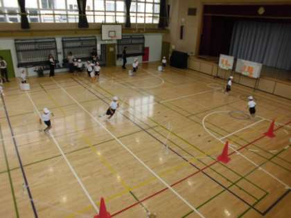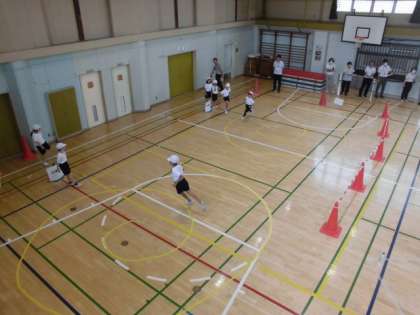 20日(水)の午後は、校内研究会でした。昨年度に引き続き、体育の研究(領域は、走・跳の運動)に取り組んでいます。今回は、低学年分科会による研究授業を行いました。1年2組の子どもたちは、「高ヶ坂パークで忍者修行」と題して、走る運動遊びをしました。ぐるぐるコース、ジグザグコース、うずまきコースをそれぞれ走って、どのように走ると走りやすいのか、気付いたことを発表しました。