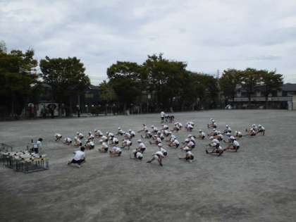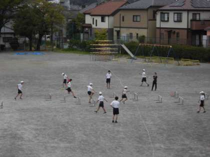 21日(木)3時間目、6年生は合同で体育の時間でした。中学生が準備運動やライン引き、計測を手伝ってくれました。最初に50m走のタイムを計測しました。その後、インターバルごとに分かれて、ハードルの練習をしました。