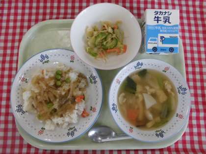 25日(月)の献立は、あんかけチャーハン、ナムル、五目スープ、牛乳です。