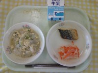 10日(火)の献立は、麦ご飯、いかのソイネーズ焼き、わかめサラダ、豚汁、牛乳です。