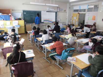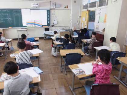 14日(火)1・2時間目、1年1組は図画工作の時間でした。「おはなしから うまれたよ」の題材です。今回は「にじいろの しまうま」の話を聞いてから想像したことを絵に描きました。