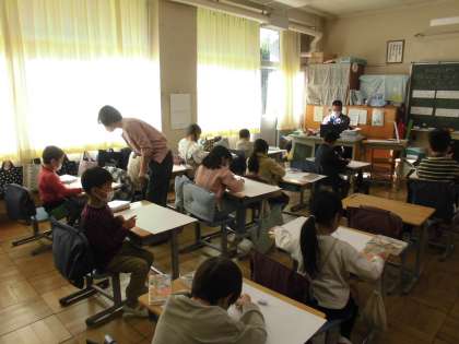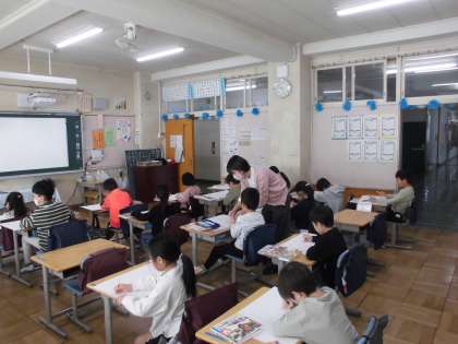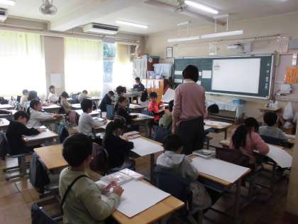 14日(火)1・2時間目、1年2組は図画工作の時間でした。「おはなしから うまれたよ」の題材です。最初に講師の先生が「にじいろの しまうま」というお話を読みました。それを聞いた子どもたちは、お話から想像したことを白い画用紙に描きました。