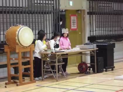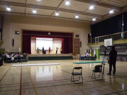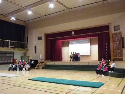 15日(水)は午前8時25分のチャイムを最後に、午前中はノーチャイムで過ごしました。子どもたちは教室で着替え、ランチルームで出番待ち、体育館の舞台袖のドアから入場します。最初の演目は、2年生の「しんせつせんたい2ネンジャー」です。演目紹介も子どもたちが行います。フロアではカメラマンがフラッシュをたきながらスナップ写真を撮り始めました。