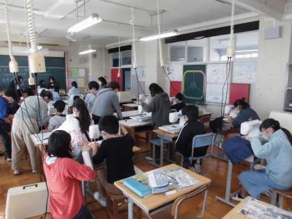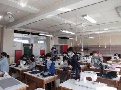 16日(木)3・4時間目、5年1組は家庭科の時間でした。「ランチョンマット」の制作の続きをしました。しつけ糸に沿って、ミシンで直線縫いをしました。返し縫いも忘れずにできました。アイロンは火傷等をしないように気を付けながら使うことができました。