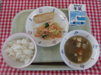 20日(月)の献立は、ご飯、いかのしょうが焼き、春雨サラダ、おけんちゃ、牛乳です。