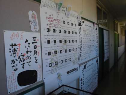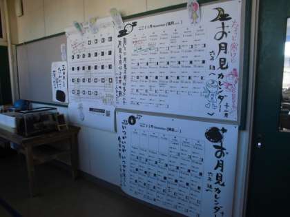 理科室前の廊下には、「お月見カレンダー」が登場しました。5・6年生の学習に使用します。講師の先生の手描きによる味わいある文字や絵がすてきです。