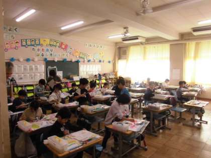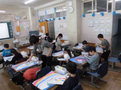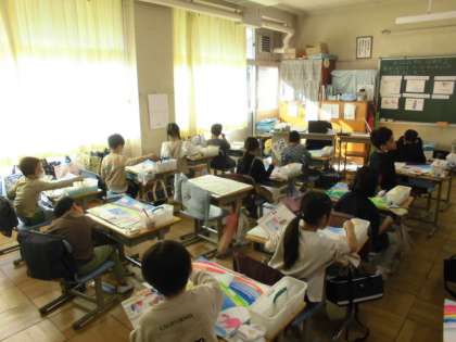 21日(火)1・2時間目、1年2組は図画工作の時間でした。先週取り組んだ「おはなしから うまれたよ」の続きをしました。「にじいろの しまうま」のお話から想像したことを絵に描き、絵の具で色をつけました。