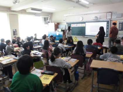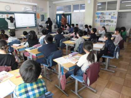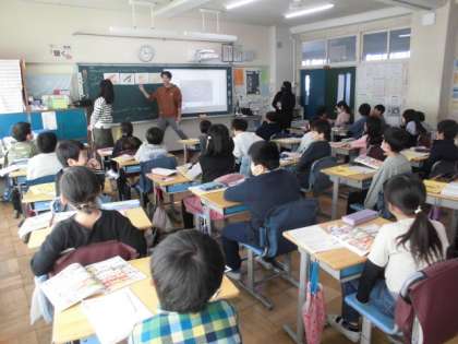 21日(火)3時間目、4年1組は外国語活動の時間でした。2組の担任の先生、MEPS、ALTの3人で進めました。今回は、食材の名前を言ったり、ほしい物を尋ねたりしました。食材は「じゃがいも」「にんじん」「きゅうり」「たまねぎ」「バナナ」の5種類でした。
