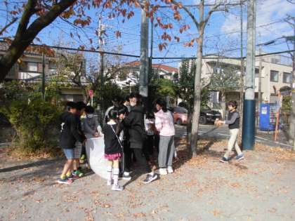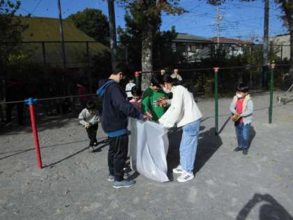 21日(火)掃除の時間、たてわり班ごとに校庭の落ち葉拾い活動をしました。今回は1組が行いました。2組は28日(火)に実施します。写真は上から、4班、5班です。6年生は大きなビニール袋の口を広げ、次々に入れられる落ち葉を中に押し込めていました。