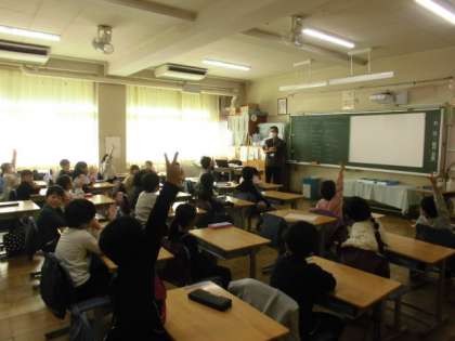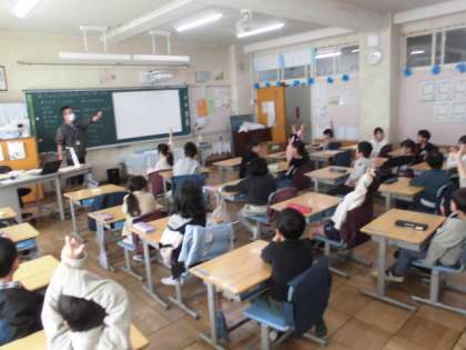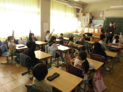 22日(水)1時間目、1年2組は生活科の時間でした。来週29日(水)に保育園の年長組さんとの交流会を前に、プレゼントの内容について話し合っていました。小さい画用紙に学校の生活の絵を描いてプレゼントをするのだそうです。子どもたちからは、運動会、遠足、こどもまつり、プール、学習発表会、あさがおなどのアイデアがたくさん出ました。