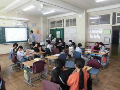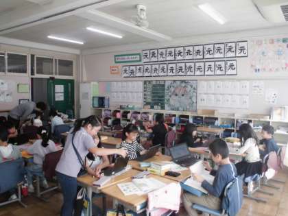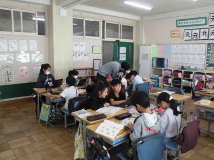 22日(水)4時間目、3年2組は国語の時間でした。「ことわざ・故事成語」の学習の続きで、今回は「故事成語」調べをしました。「矛盾」「五十歩百歩」「蛍雪の功」「背水の陣」などの意味をみんなで学習してから、タブレット端末を使いながらグループで調べました。