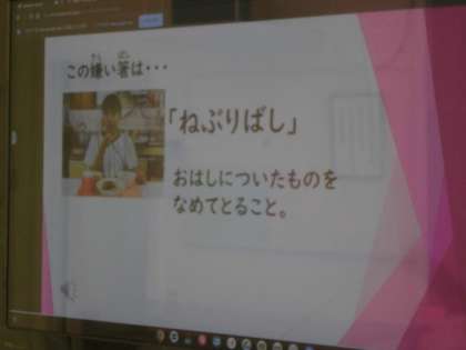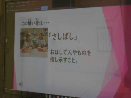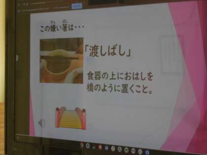 22日(水)給食の時間、栄養教諭による「食事マナー」の学習を行いました。本日で3日目です。最終回のテーマは「正しいおはしのマナー」です。写真は上から、「さしばし」「渡しばし」「ねぶりばし」です。「さしばし」は食べ物を箸でさして食べる他に、人やものに箸先を向けることも言います。学校でもご家庭でも「食事のマナー」に気を付けていきたいです。