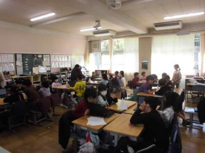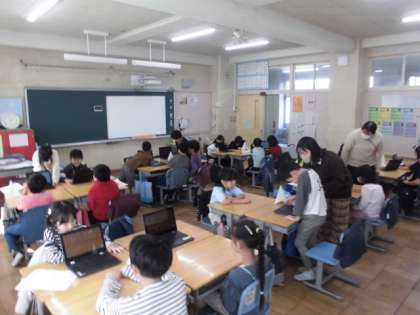 22日(水)5時間目、2年生は2クラス合同で生活科の発表会をしました。発表の内容は、インタビューに行った「えがおのひみつ たんけんたい」です。これまでにタブレット端末に写真を入れたり、文字を入力したりしてまとめてきました。2組では2組の子が発表者、1組の子が聞き役になりました。制限時間になると聞き役の1組の子が席を移動して次の発表を聞きました。