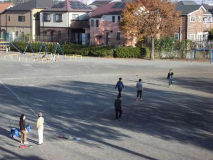 22日(水)放課後、体育的行事担当の先生たちで校庭にペグ打ちをしました。27日(月)から運動旬間の一つとして「持久走」に取り組むためです。トラックのラインを引くので、距離を確認しながら作業をしました。