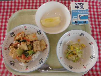 27日(月)の献立は、家常(ジャージャン)豆腐丼、キャベツとコーンのソテー、果物(りんご)、牛乳です。