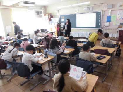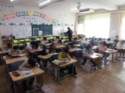 6日(水)1時間目、1年2組は外国語活動の時間でした。担任の先生とALTとで進めています。今回は、6種類の動物と6つの色を学習しました。ぬり絵にもなるワークシートに、子どもたちは喜んで取り組んでいました。