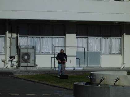 6日(水)冬芝の養生が一部解除されました。養生は先月から始まりましたが、子どもたちが約束を守ってくれたおかげで緑色がとても鮮やかです。今回は池の周囲にある芝生を解除しました。主事さん方が、落ち葉を掃いたり、芝生を短く刈ったりしました。
