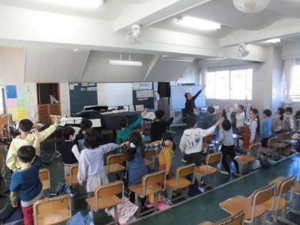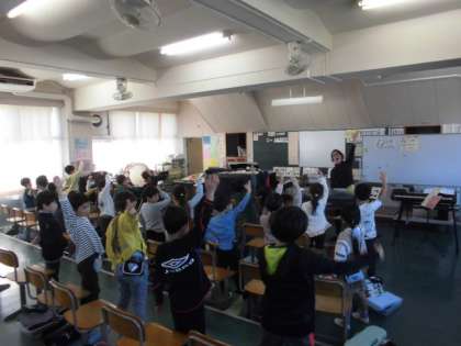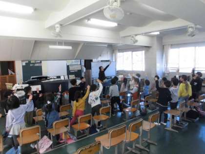 6日(水)5時間目、1年1組は音楽の時間でした。音楽室までの移動にも慣れてきました。はじめの挨拶は歌を歌って行います。腕をぐるりと回しながら、きれいな声を出していました。その後、今月の歌の練習をしたり、鍵盤ハーモニカを吹いたりしました。