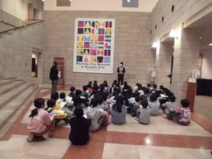 7日(木)4年生は町田市立国際版画美術館に見学に行きました。午前10時前に到着しましたが、一般の方より先に入場させていただきました。学芸員の方のお話を伺い、3つのグループに分かれて2階の展示会場に移動しました。今回は「揚州周延(ようしゅう ちかのぶ)明治を描き尽くした浮世絵師」展を鑑賞しました。木版画を経験している子どもたちですが、作品も版画だと知って驚いていました。マナーを守り、鑑賞態度も立派でした。