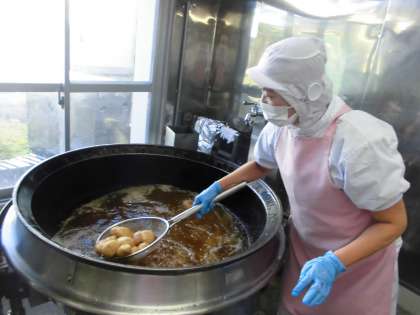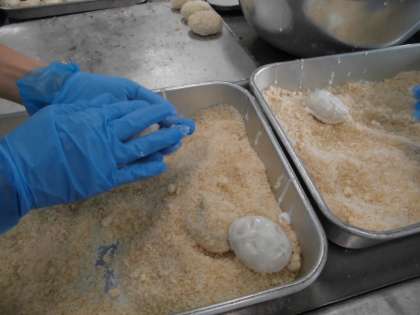 8日(金)の給食は、コロッケです。具をこねて形を作り、揚げていきます。今回は米粉のパン粉を使って外はカリッと、中はほくほくに仕上げました。子どもたちに大人気で、朝から楽しみにしている様子がうかがえました。