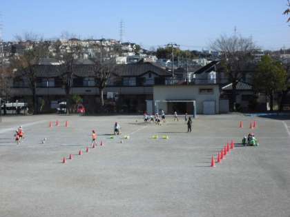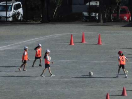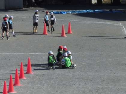 8日(金)1時間目、3年1組は体育の時間でした。校庭でゴール型ゲームの「ラインサッカー」をしました。2チームがゲームをしている間、他の2チームは、ドリブルの練習をしたり、相談をしたりしました。