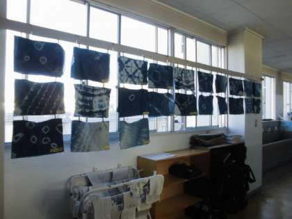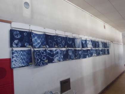 4年生の廊下には、子どもたちが染めた藍染の手ぬぐいが飾られています。模様や染まり具合は一人一人違い、とてもすてきな作品が並んでいます。写真は上から、1組、2組の順です。