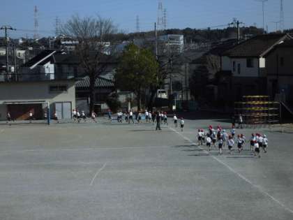 8日(金)中休み、1年生と2年生による持久走の練習です。先生の笛の合図で反時計まわりに走り出しました。時間まで元気に走る姿がありました。