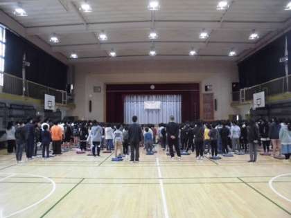 11日(月)保健環境委員会の発表が終わり、続いて今月の歌「花束を空になげよう」を歌いました。子どもたちのきれいな歌声が体育館内に響き渡りました。最後に、集会委員による終わりの言葉で教室に戻りました。