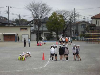 11日(月)2時間目、1年生と6年生は持久走大会のリハーサルを行いました。1年生と6年生がペアを組みます。1年生が走った周数を6年生が数えるためです。準備運動の後、6年生がスタート位置に並びました。遊具側が1組グループ、鉄棒側が2組グループです。1年生は「がんばれー」と元気な声で応援していました。