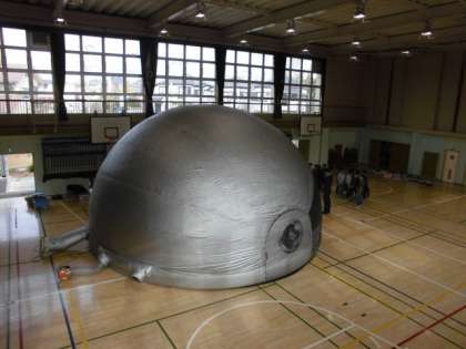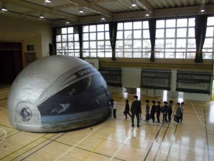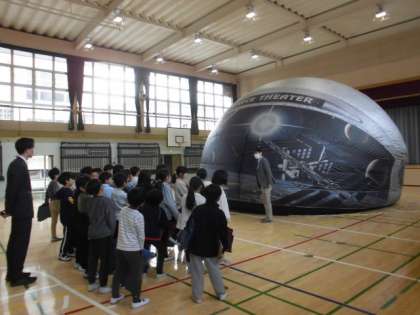 11日(月)3・4時間目、4年生は理科の時間でした。今回は「冬の星」の学習です。体育館にプラネタリウムを設置してもらい、その中に入って寝そべりながらオリオン座や月の動きを観察しました。3時間目に1組、4時間目に2組が学習しました。写真は2組の様子です。有料のため保護者の皆さまにはご負担をおかけしましたが、校外に出ることなく観察できたことは良かったです。