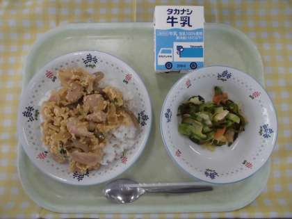 12日(火)の献立は、親子丼、海藻サラダ、牛乳です。