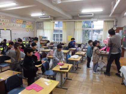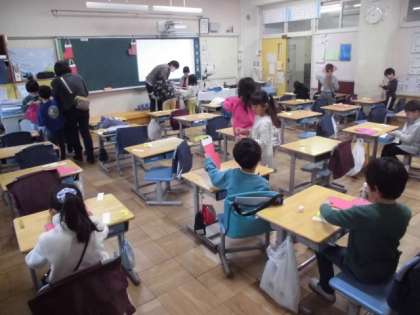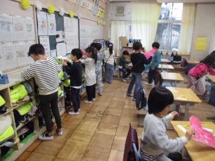 12日(火)1・2時間目、1年1組は図画工作の時間でした。先週の続き「コロコロあみもの」に取り組みました。絵の具のついたビー玉を転がし、できた模様を長靴の形に切り、テープで貼り合わせました。黄色の持ち手を付けて完成です。
