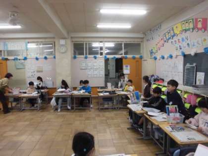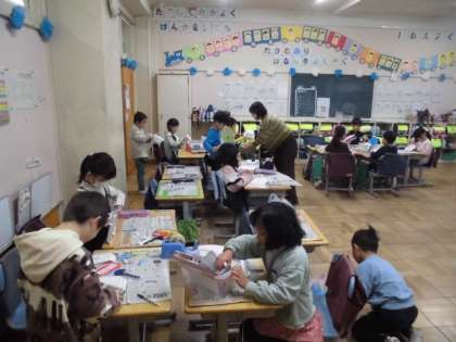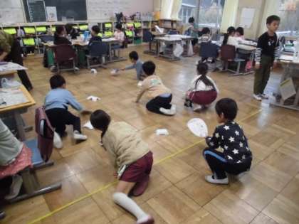 12日(火)1・2時間目、1年2組は図画工作の時間でした。発泡スチロール製のカップや皿の一部を切り取ってうちわで扇ぐと動くおもちゃに変身しました。教室の中央を広く開け、遊びの場にしました。