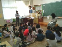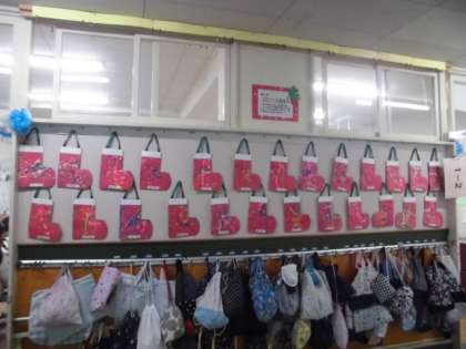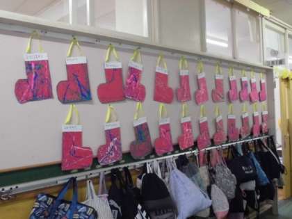 12日(火)、1年生の廊下に図画工作の時間に作った「コロコロあみもの」を掲示しました。自分だけの模様のついた長靴です。
