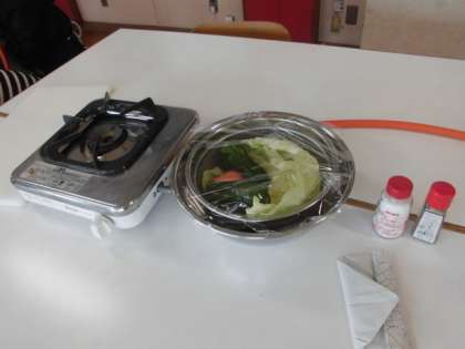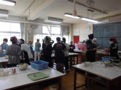 12日(火)5・6時間目、6年1組は家庭科の時間でした。今回は初めて調理実習に取り組みました。自分で作ったエプロンを着て、「三色野菜いため」を作りました。6グループに分かれ、それぞれに「洗う、切る、いためる」の順で作業をしました。