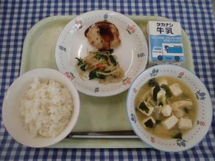 15日(金)の献立は、ご飯、お魚ハンバーグ、ごま和え、かぶと白菜のみそ汁、牛乳です。