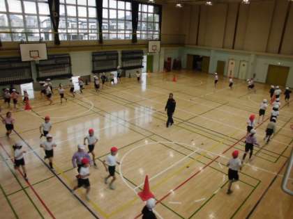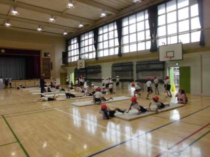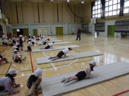 15日(金)2時間目、2年生は合同で体育の時間でした。準備運動をしてから、体育館内で持久走の練習をしました。その後、マットを出して「マット運動遊び」をしました。写真はアザラシ歩きをしているところです。