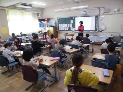 18日(月)2時間目、1年1組は初めて書き初めをしました。硬筆での書き初めです。黒板には手本が示され、句点や読点、かぎかっこの位置を分かりやすく表示していました。名前まで書き終えた人から、先生のところに出しに行きました。