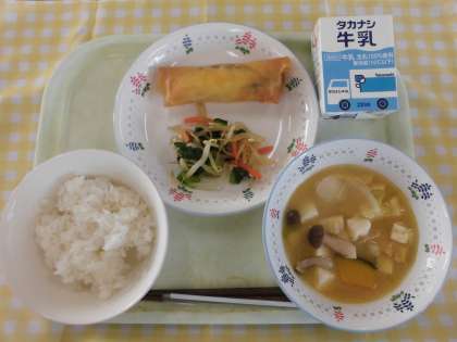 19日(火)の献立は、ご飯、ししゃものチーズ包み揚げ、おひたし、田舎汁、牛乳です。