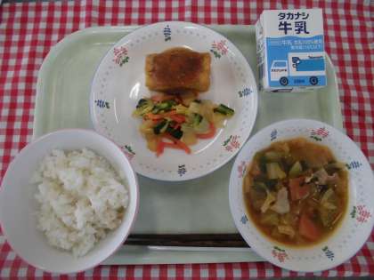 19日(月)の献立は、ご飯、生揚げの照りソースかけ、ゆず和え、キムチスープ、牛乳です。