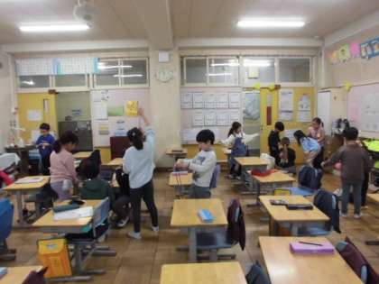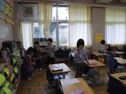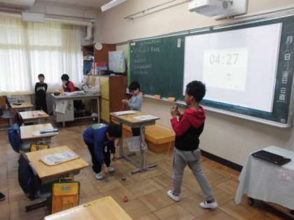 19日(月)4時間目、1年1組は生活科の時間でした。「むかしあそび」発表会に向けてグループに分かれて練習をしました。あやとり、こままわし、けん玉、お手玉です。子どもたちは張り切って取り組んでいました。